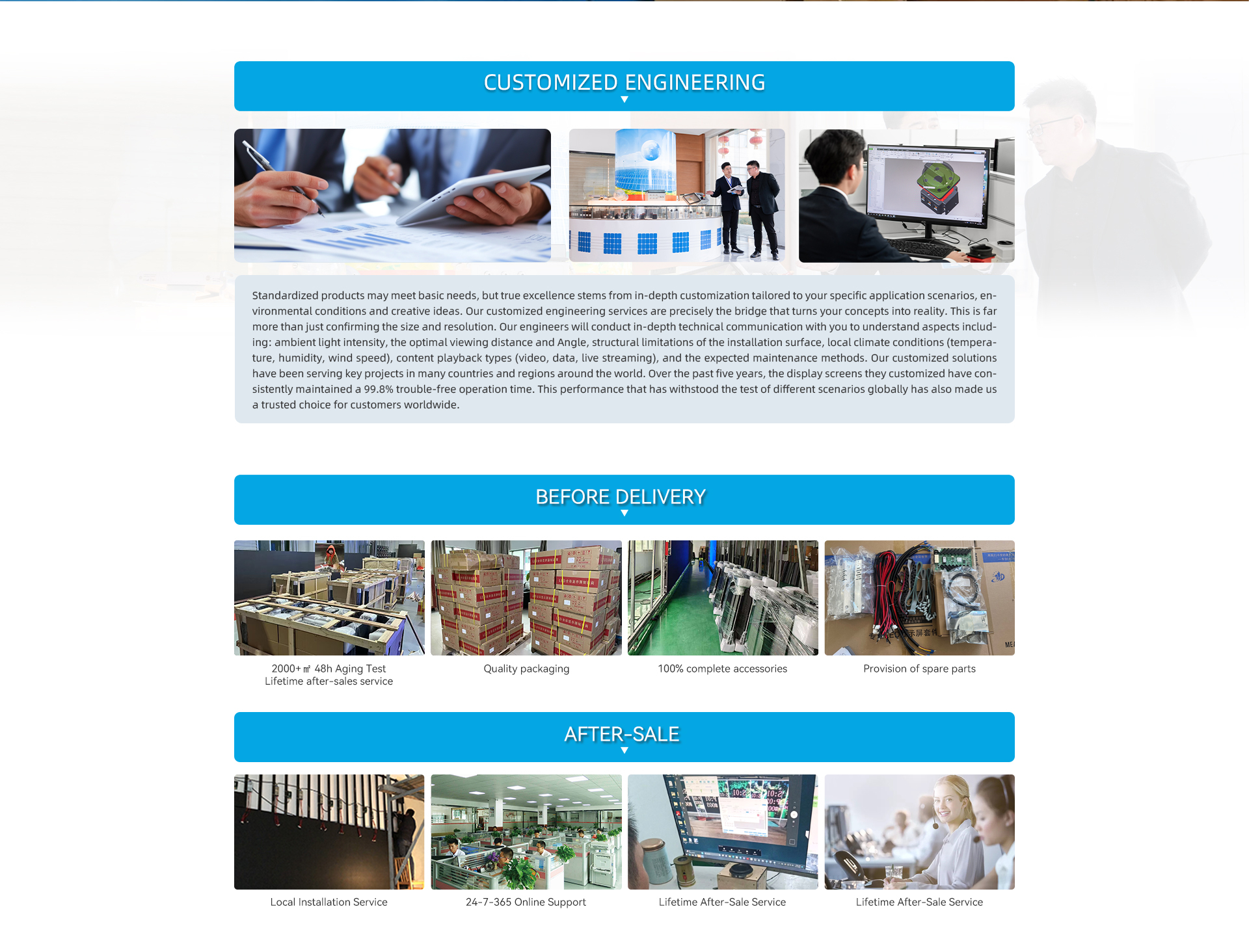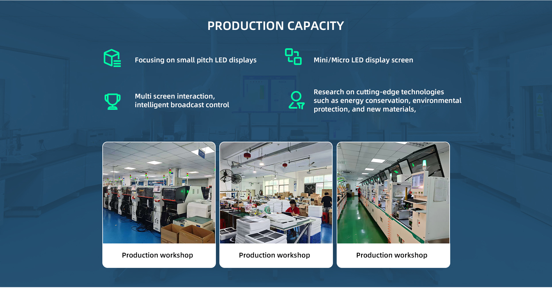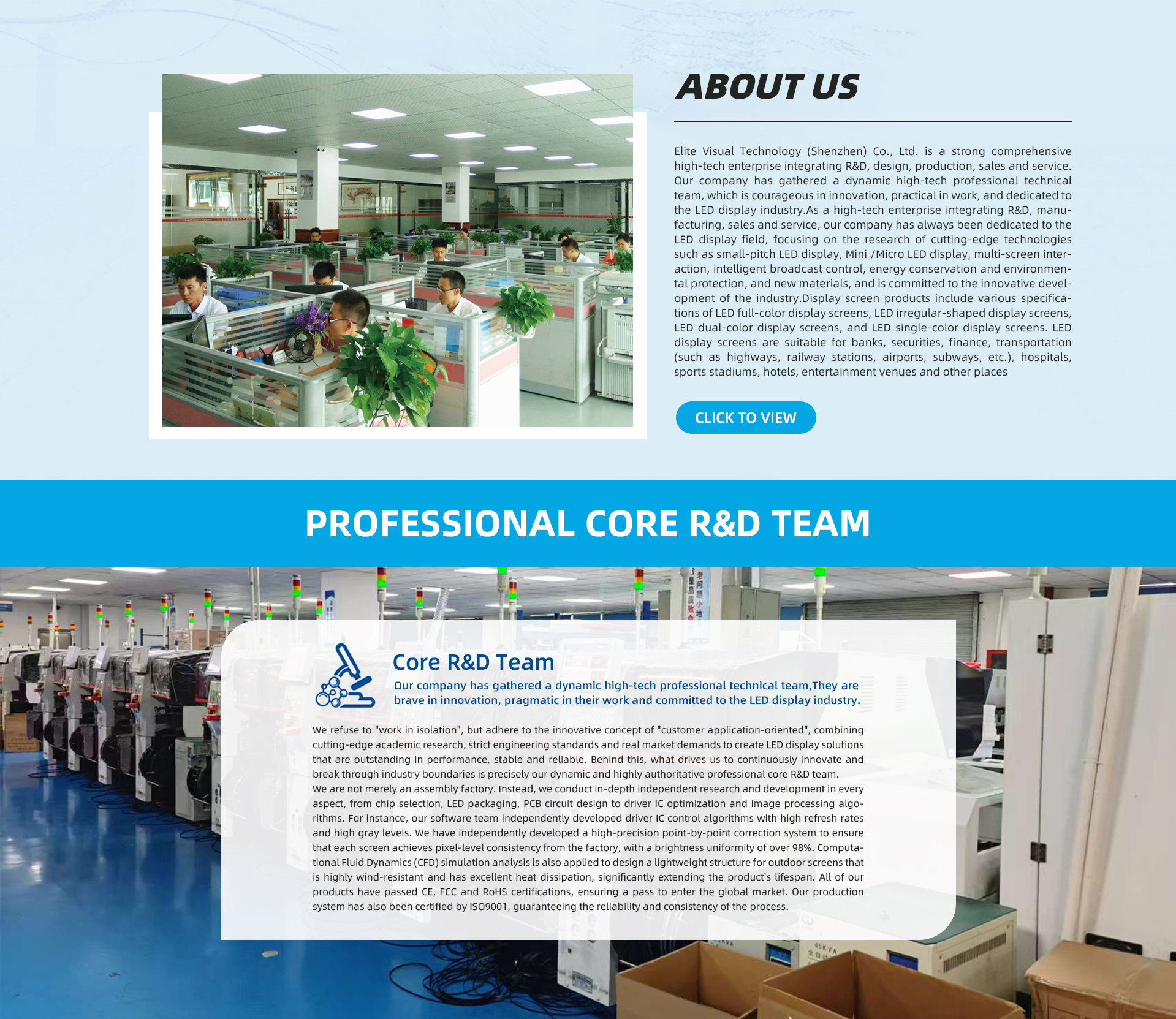 Productos principales:Pantalla LED para interiores, pantalla LED para exteriores, pantallas LED de forma irregular, pantalla LED transparente, personalizada